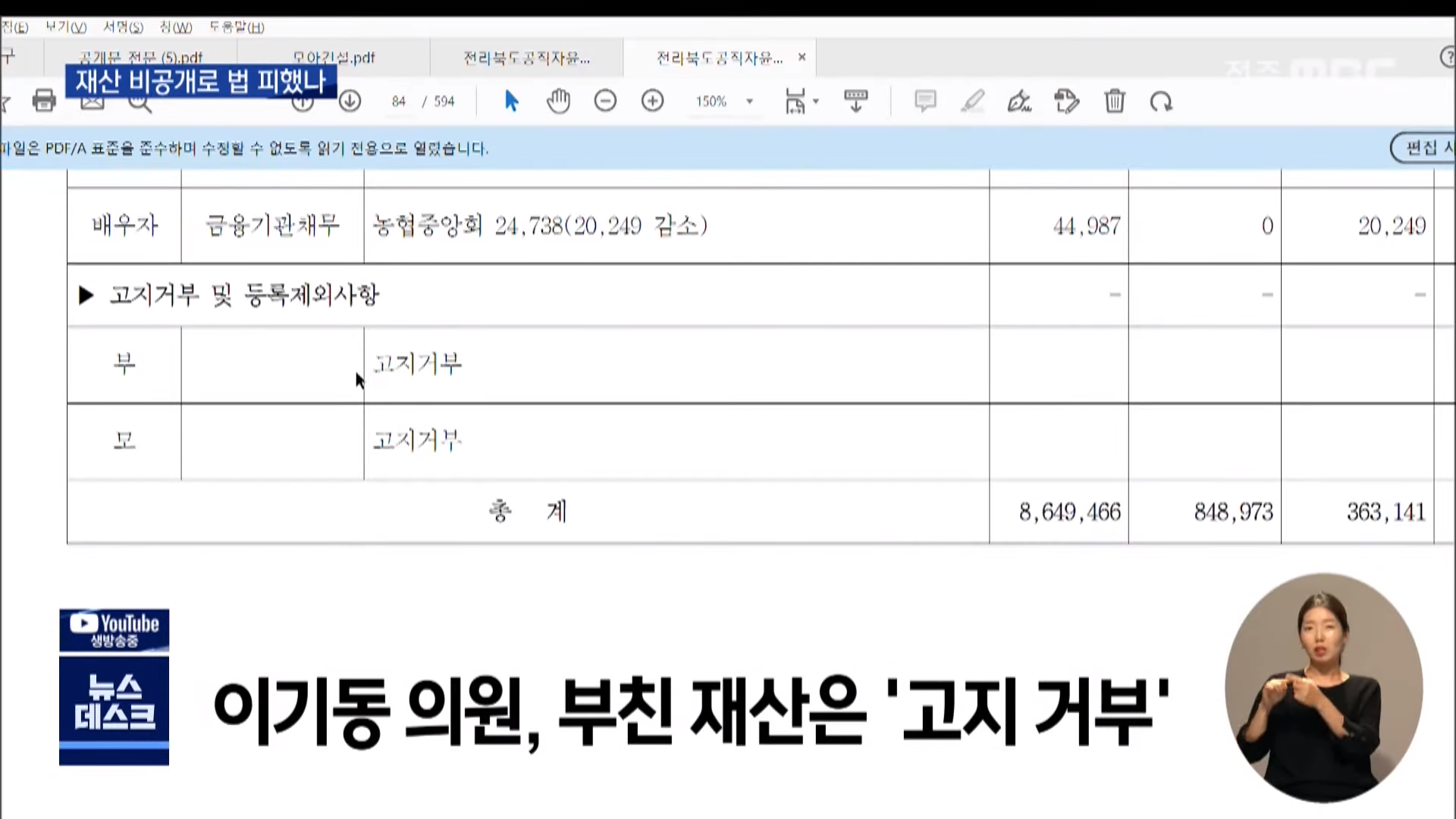 이기동 의장의 재산 공개 내역을 살펴보니 본인이 소유한 지분만 공개했고, 가족이 소유한 지분에 대해서는 비공개했는데요, 전주MBC는 이를 근거로 “이기동 의원이 몰랐는지, 알고서도 가족의 재산 신고를 거부하면서 이를 피해 갔는지 강하게 의혹이 제기되는 대목이다. 이 의원의 건설회사는 전주시와 계약 당시 지분구조에 문제가 없다는 허위 각서까지 제출한 것으로 확인됐는데, 이는 알고서도 법을 위반하려는 의도가 있었다는 점을 뒷받침하고 있다.”라고 보도했습니다.